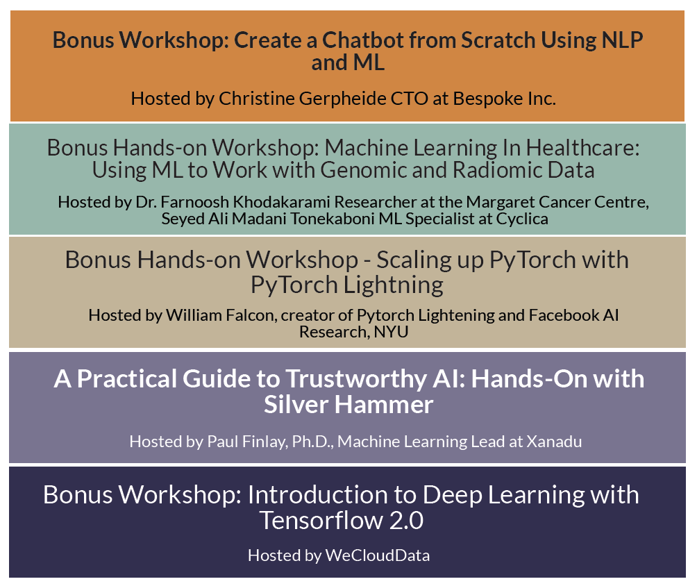 Practitioners will dissect technical approaches, case studies, tools, and techniques to explore challenges within Natural Language Processing, Neural Nets, Reinforcement Learning, Generative Adversarial Networks (GANs), Evolution Strategies, AutoML and more.