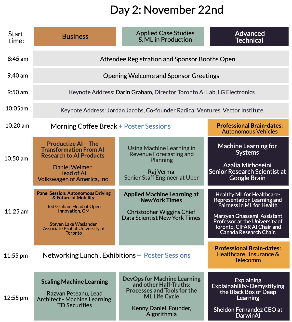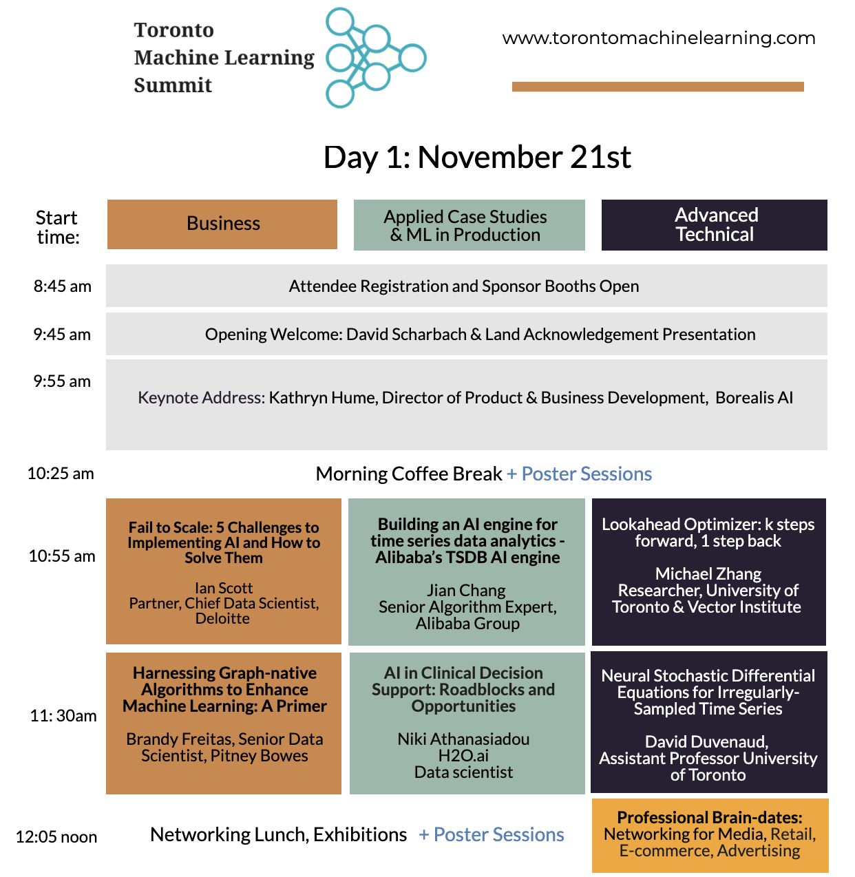 The event will have three tracks: One for Business, one for Advanced Practitioners/Researchers and one for applied use-cases (Focusing on various Industries). Business Executives, PhD researchers, Engineers and Practitioners ranging from Beginner to Advanced. See Attendee Demographics and a list of the Attendee Titles from our past event here.